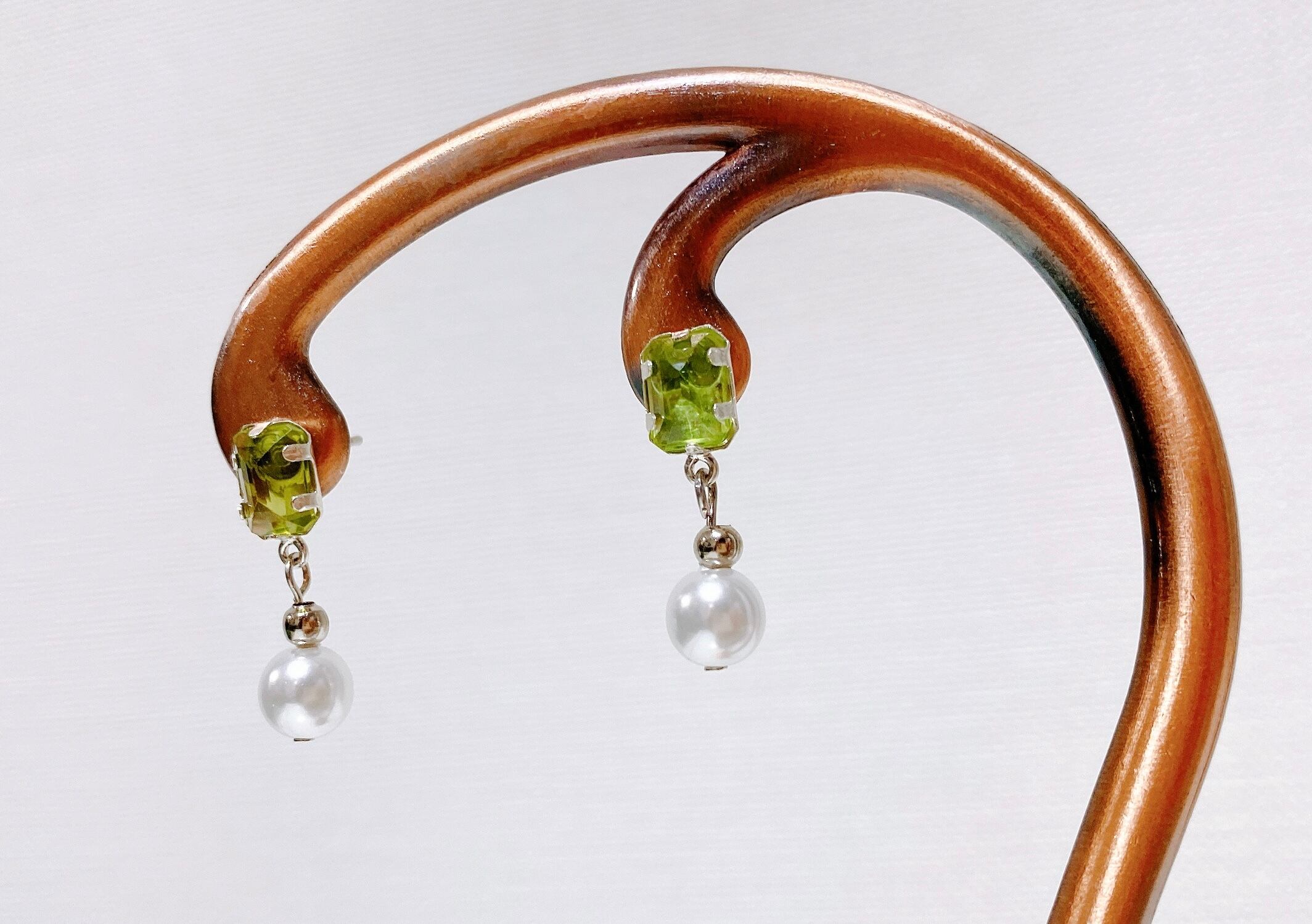 天然石であるペリドットを使用し、パールビーズをあしらったピアスです。